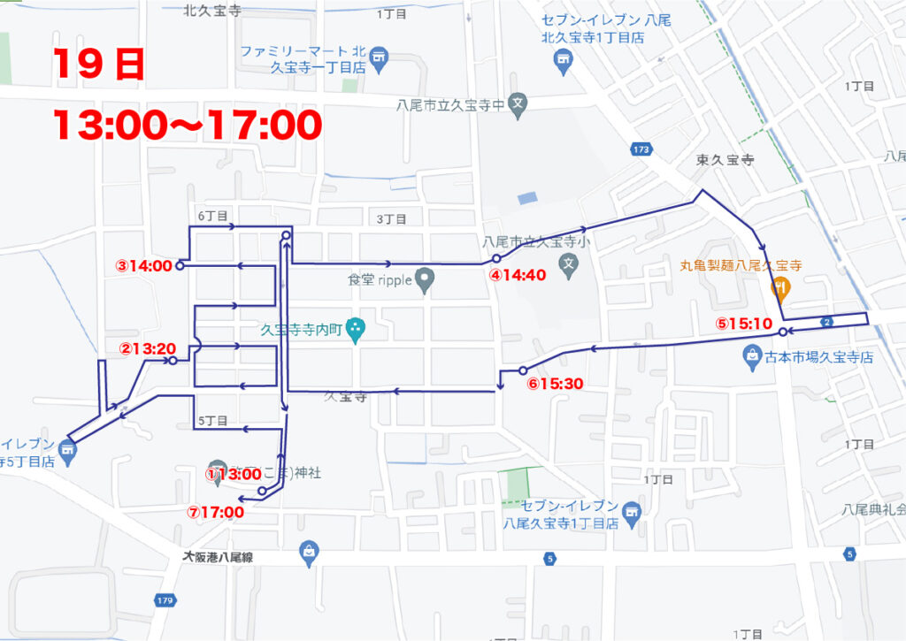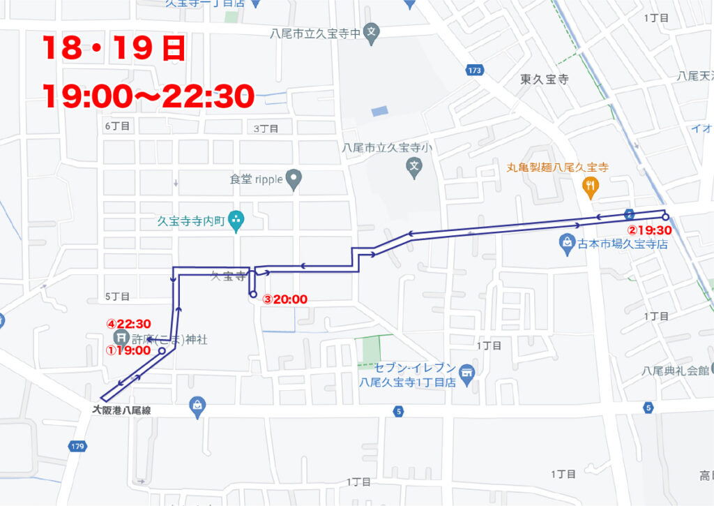 神輿(みこし)等はおおよそ下図の経路を移動します。地点通過時刻及び経路は変更する場合があります。